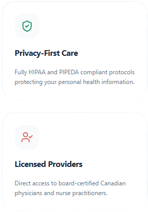 After your consultation, your provider will recommend the most appropriate treatment based on your symptoms. You may get prescriptions, doctor’s notes, lab requisitions, or referrals. Prescriptions can be sent to your preferred Canadian pharmacy, where pickup or delivery options may be available depending on your location.