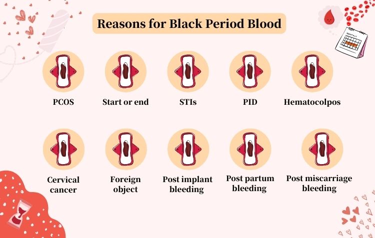 Black blood in a period can be a sign of an underlying health condition like endometriosis, uterine fibroids, etc. It can also indicate ectropic pregnancy if other symptoms, like pain, foul smell, itching, etc., accompany black blood. Therefore, it is advised to consult a doctor for proper diagnosis.